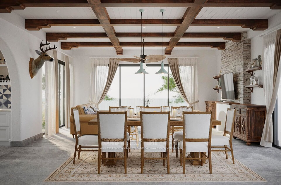 Mẫu bàn ăn biệt thự gỗ tự nhiên 6 ghế phong cách tân cổ điển sang trọng và tiện nghi cho không gian phòng bếp