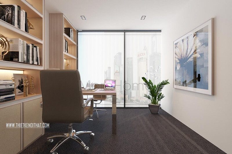Thiết kế văn phòng làm việc nhỏ hiện đại với đầy đủ công năng từ thiết bị máy tính đến tủ tài liệu