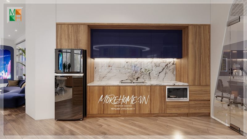 Trang trí văn phòng làm việc có bếp riêng tiện lợi cho sử dụng quá trình nấu nướng ăn uống của nhân viên.