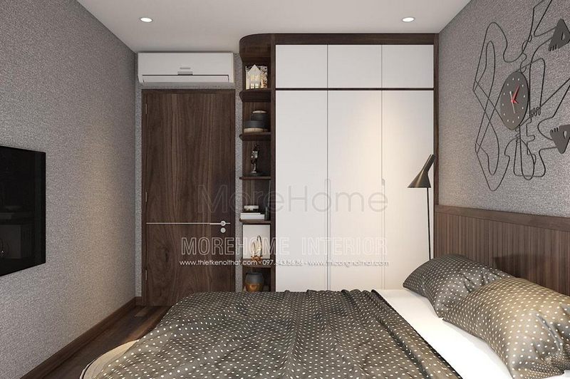 Thiết kế nội thất phòng ngủ diện tích nhỏ hiện đại, chiếc tủ quần áo gỗ công nghiệp kịch trần kết hợp kệ tủ đa năng vừa sử dụng để đặt sách, vừa dùng để đặt đồ decor trang trí
