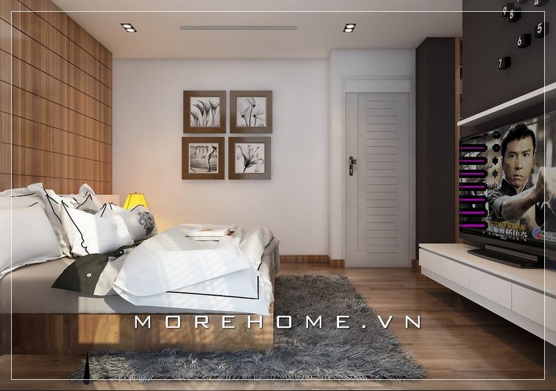 Bố trí nội thất phòng ngủ chung cư đơn giản, chiếc kệ ti vi hiện đại treo tường là giải pháp hữu hiệu tiết kiệm thêm một khoảng diện tích cho không gian nhỏ