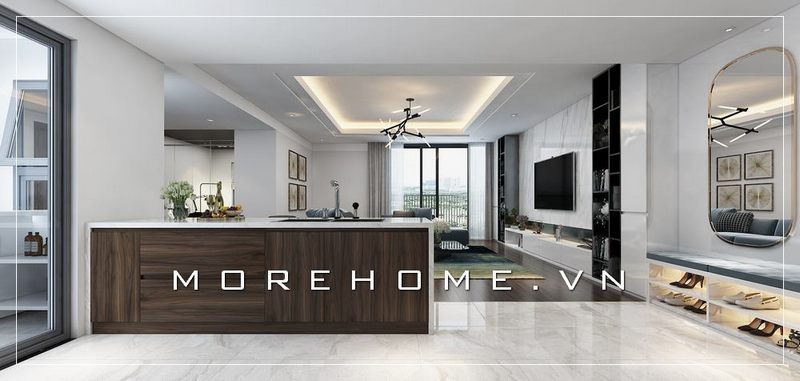 Mẫu bàn đảo bếp ốp đá cao cấp màu trắng hiện đại, vừa là vách ngăn cách giữa các không gian của căn phòng